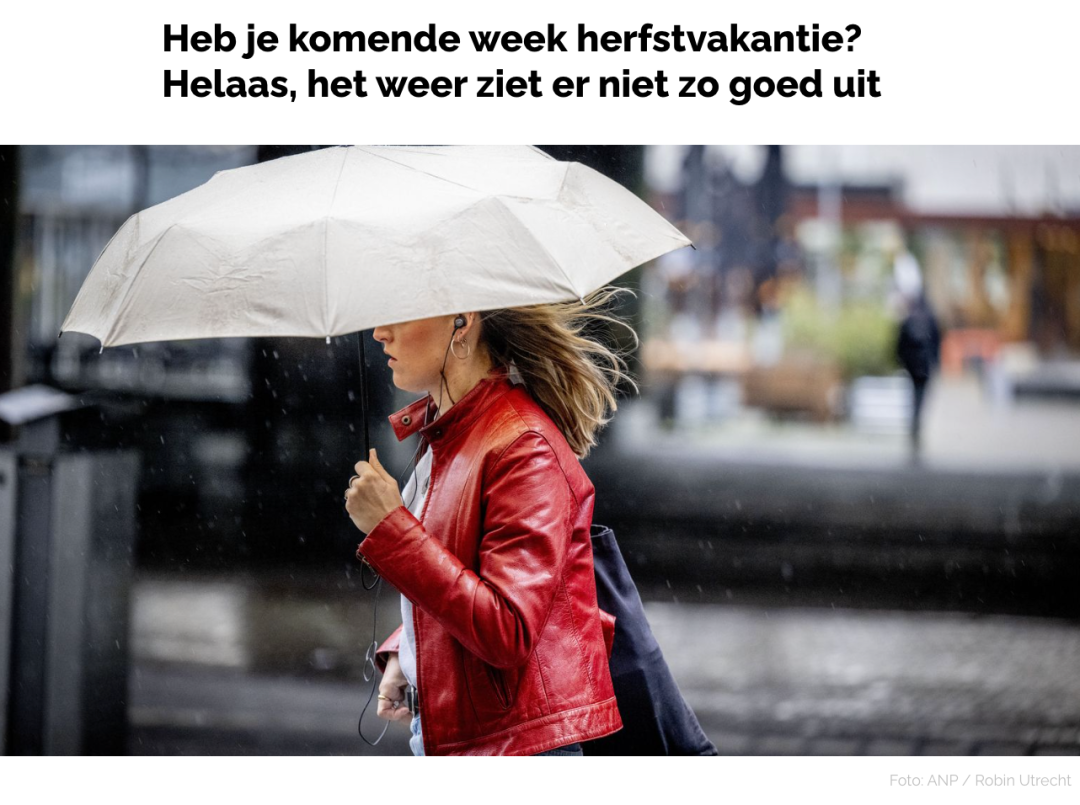 据telegraaf.nl报道,南部地区的秋假刚过,中部和北部的荷兰人本周也迎来了期待已久的假期。但如果你打算趁机外出放松,恐怕得多备一把伞。